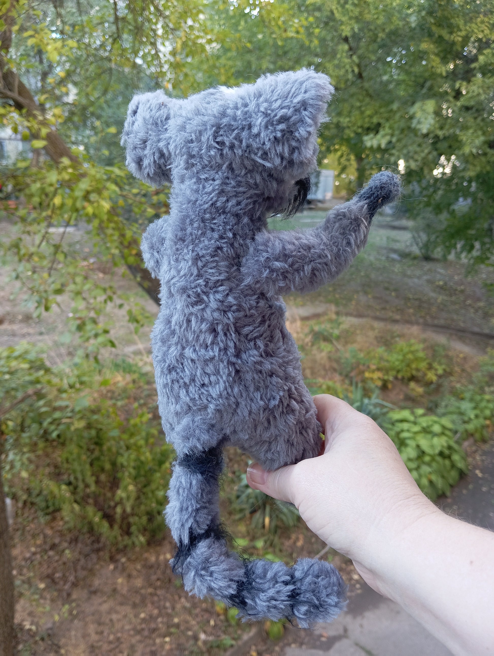 Materials: Plush yarn, glass eyes, polymer clay, wire frame