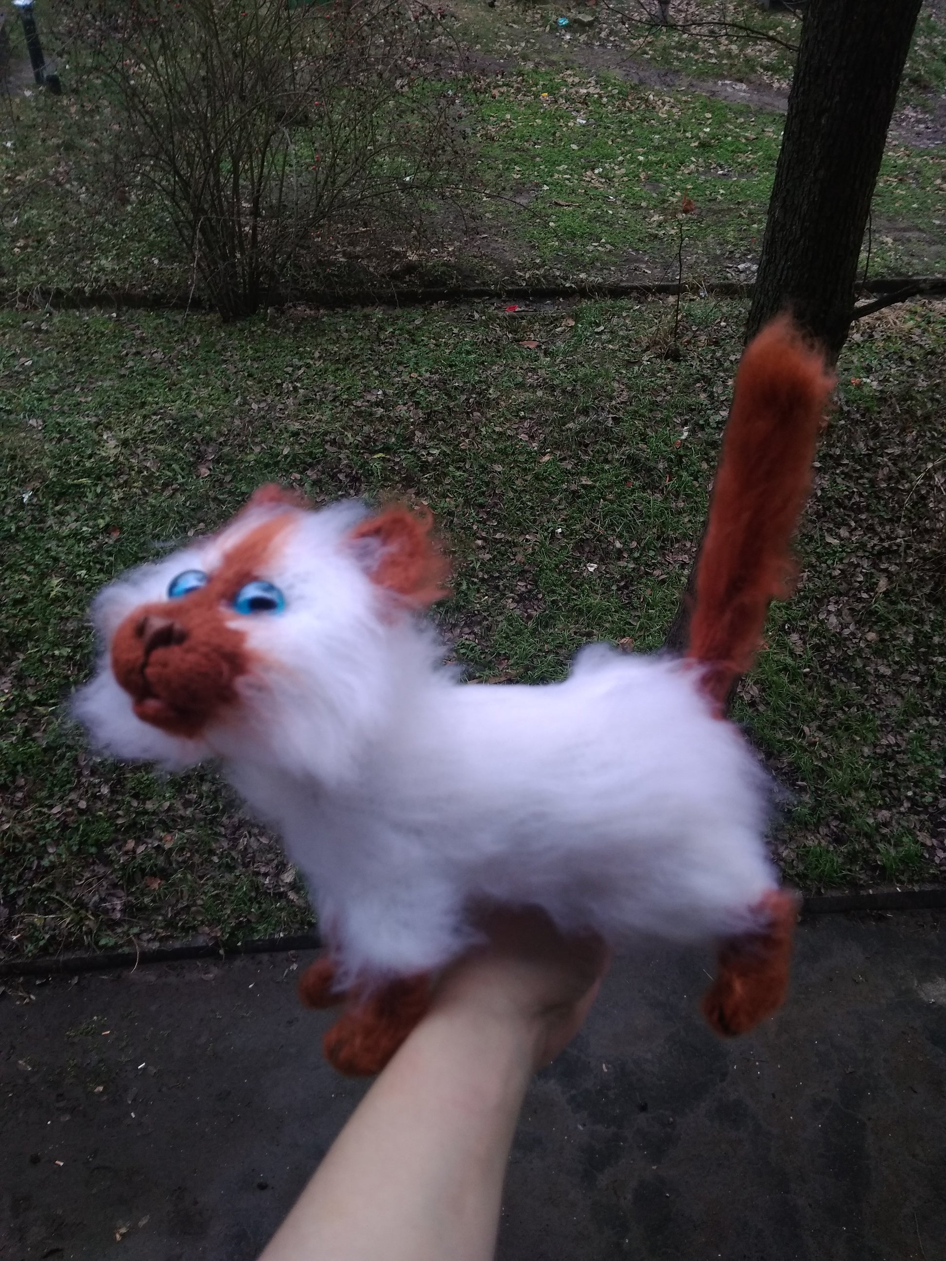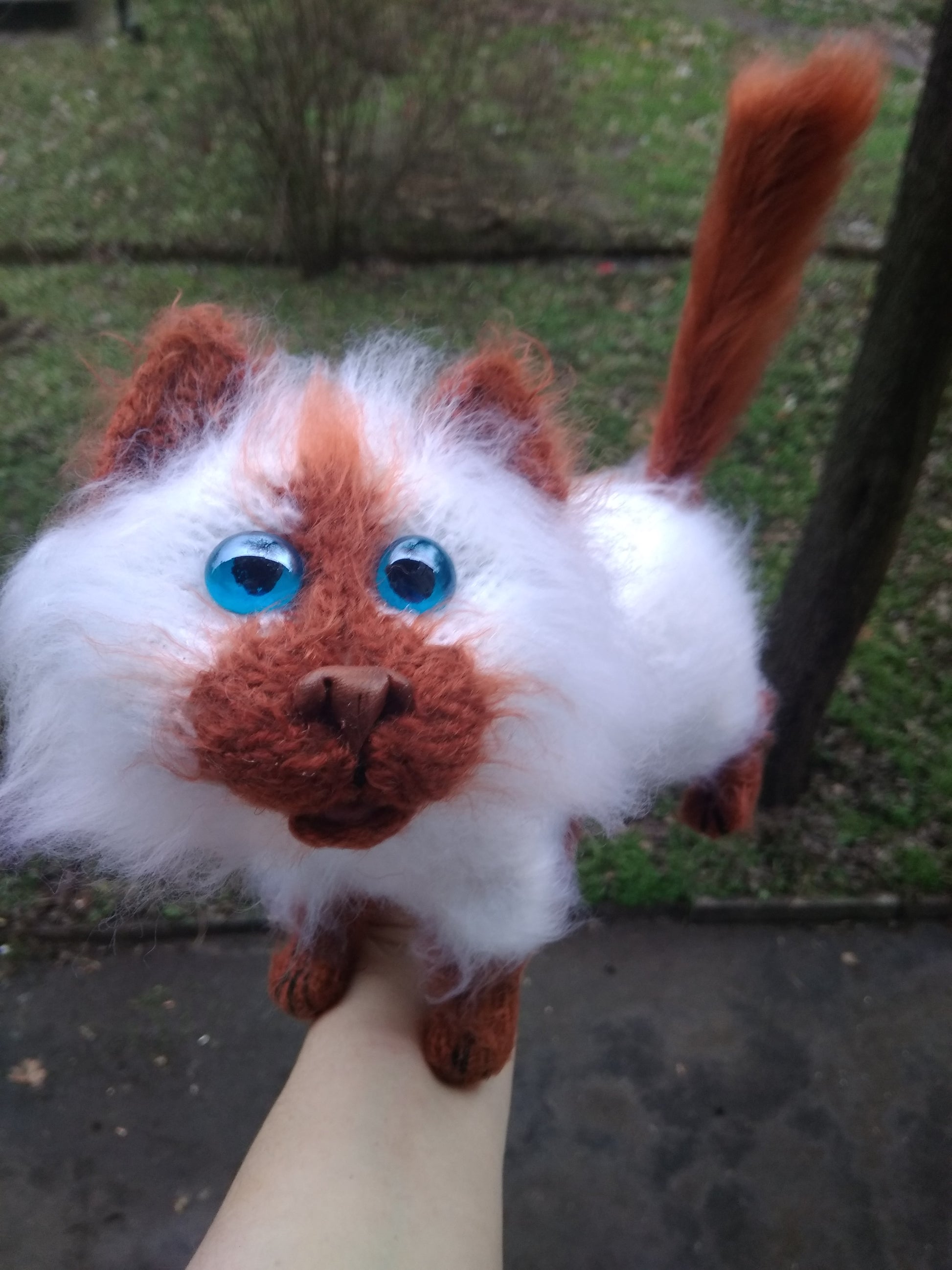 Knitted from fluffy yarn , the inside is polyester fiber ,wire frame , glass eyes ,